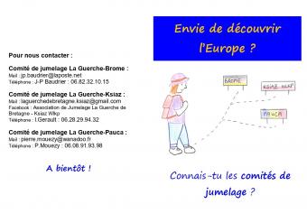 Le 31 mars dernier, l’association cantonale de La Guerche-Ksiaz a réuni toutes les personnes intéressées par notre séjour à Ksiaz du 11 au 18 août. Nous sommes ravis puisque 44 personnes se sont inscrites, de 11 à 82 ans. Certains viendront pour la première fois et d’autres pour la cinquième fois. Nous sommes évidemment très contents. Nous souhaitons vivement qu’un élu nous rejoigne au dernier moment ne serait ce que pour quelques jours. Le 09 mai, nous avons participé avec le comité de jumelage de Brome (Allemagne) et celui de Pauca (Roumanie) à la fête de l’Europe sur le marché guerchais en tenant un stand et en diffusant en ville les différents hymnes. Nous œuvrons de plus en plus ensemble pour avoir une meilleure visibilité des jumelages et de nos actions communes. Nous avons édité un flyer avec les coordonnées de chacun, que nous distribuons un peu partout. Nous avons suggéré communément la nomination d’un rond-point « Rond-point de l’Europe » auprès de la municipalité. Pour l’anniversaire de la maison de la Bretagne du 21 au 25 juin à Poznań, nous serons 2 à participer (la présidente et une infirmière libérale à domicile).